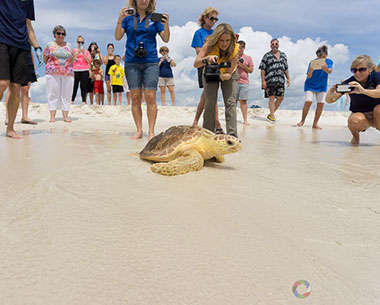 A boat strike victim, Charlie’s case was unique; initially the turtle was not moving its rear flippers, which led Gulf World staff to believe that Charlie was going to be permanently paralyzed. Gulf Coast Regional Medical Center* graciously allowed the use of their CT and MRI machines to assist Gulf World veterinary staff in understanding Charlie’s condition. Dr. Staggs, GWMI Veterinarian, found that despite severe trauma to the vertebra, miraculously Charlie recovered movement and feeling of his/her hind flippers. During the rehabilitation process, both western and eastern medicine practices were used to aid in Charlie’ recovery. The therapy regimen included cold laser therapy to reduce inflammation and the use of local beeswax donated by Tupelo Beekeepers Association to heel his carapace (top shell). The bone structure of the carapace healed enough that he was medically cleared for release by the Florida Fish and Wildlife Conservation Commission (FWC) after 14 months of rehabilitation at Gulf World Marine Institute. The external carapace will complete the healing process over time just like a human’s wound.